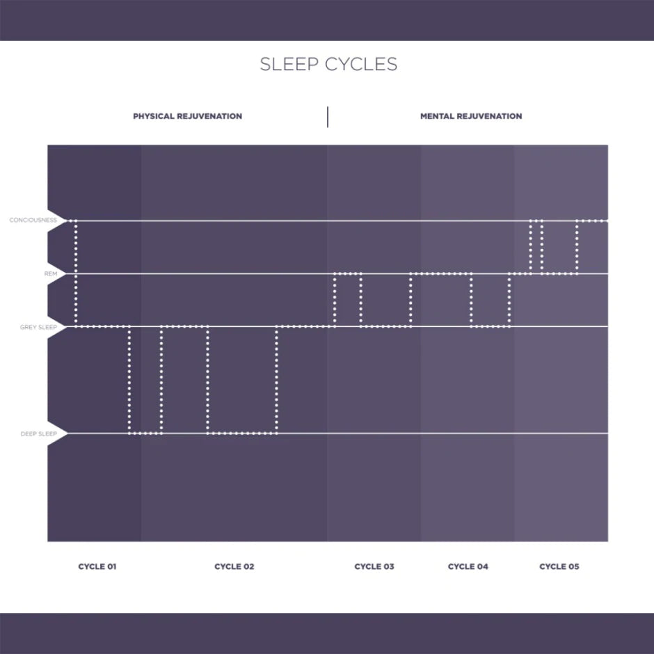 There are two separate aspects to sleep: cycles and stages. Cycles happen throughout the night and are measured in time, whereas stages are the depth with which we experience the cycle we’re in. There are four stages in the sleep process. Each of these stages are vital to living well, as they help rejuvenate our minds and bodies. The stages are Consciousness, Grey Sleep, Deep Sleep, and REM sleep.